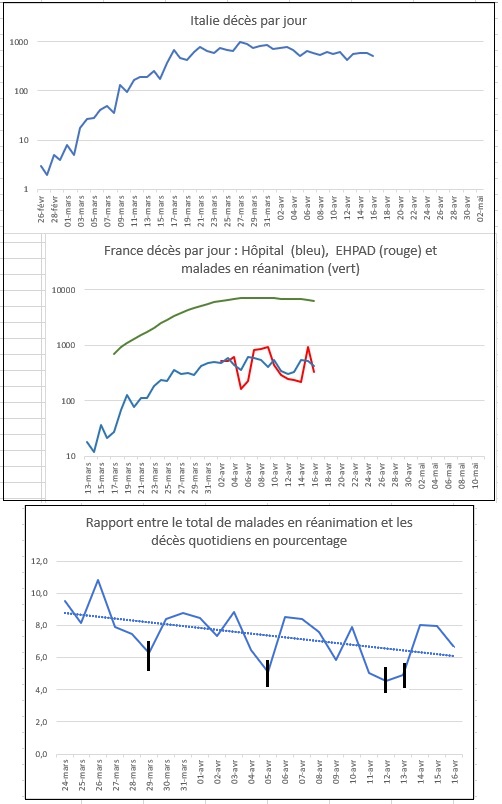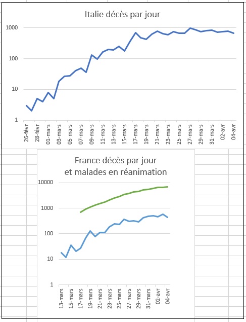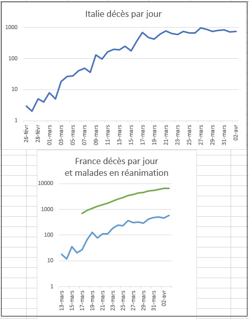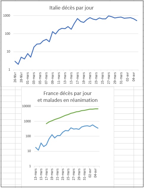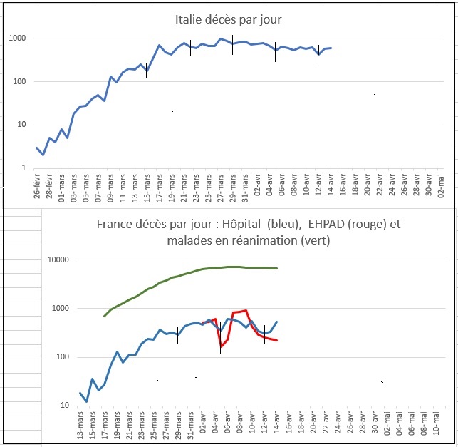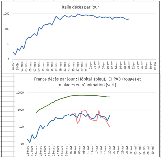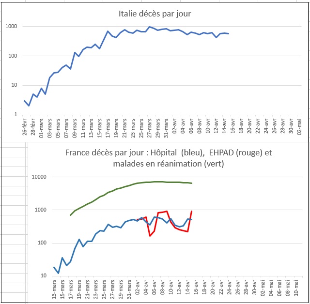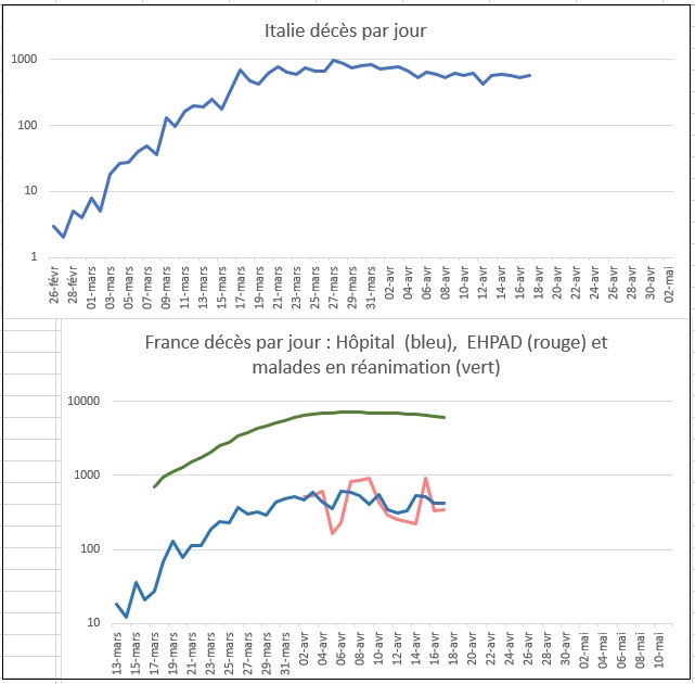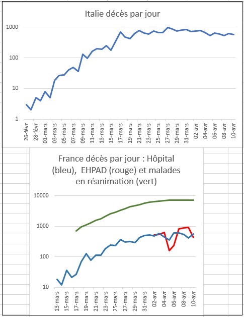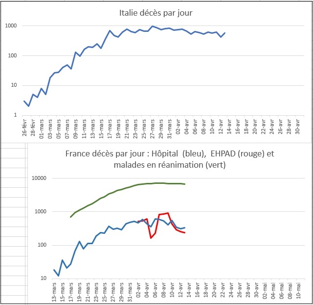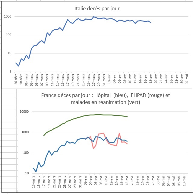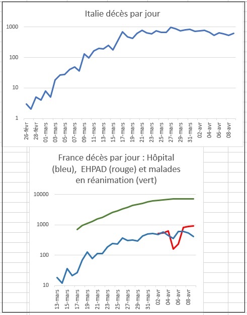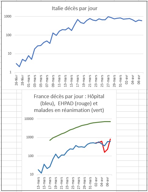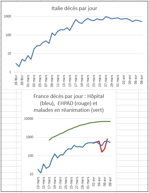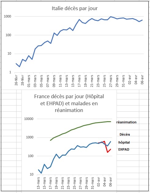 La remontée en France de ce jour peit indiquer que l'on se dirige vers un plateau long analogue à ce qui se passe en Italie mais elle peut-être due à la sous-estimation du lundi de Pâques également jour ferrié : on verra demain ce qu'il en est.