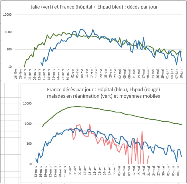 Au sommet de la courbe en France, vers le 8 avril, il y a bien eu 500 décès de plus en France qu'en Italie mais c'était dû à l'entrée dans les comptes des Ehpad. Si en fin de parcours, les totaux français sont inférieurs aus italiens, ce n'est que d'une dizaine de cas et on peut donc dire que les évolutions sont pratiquement identiques.