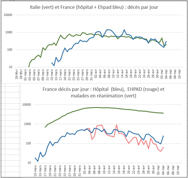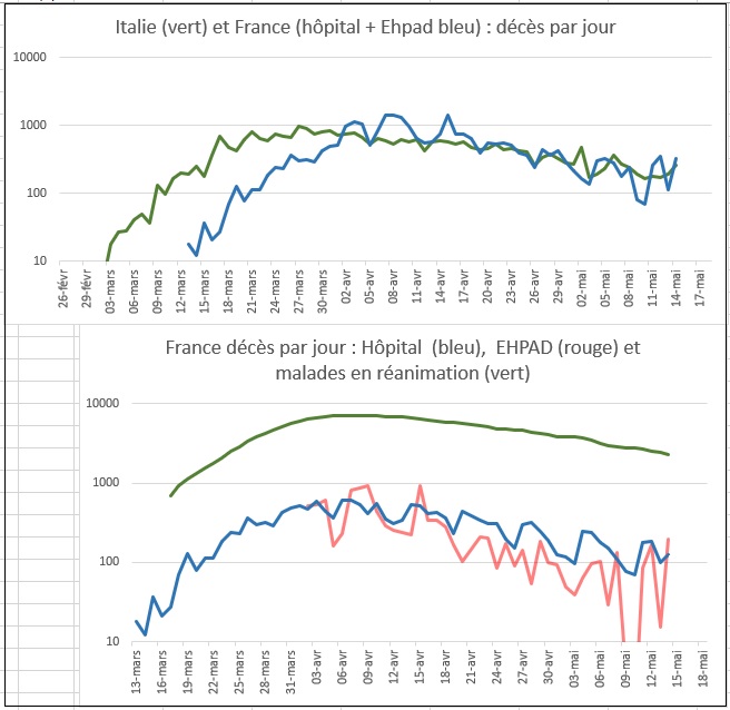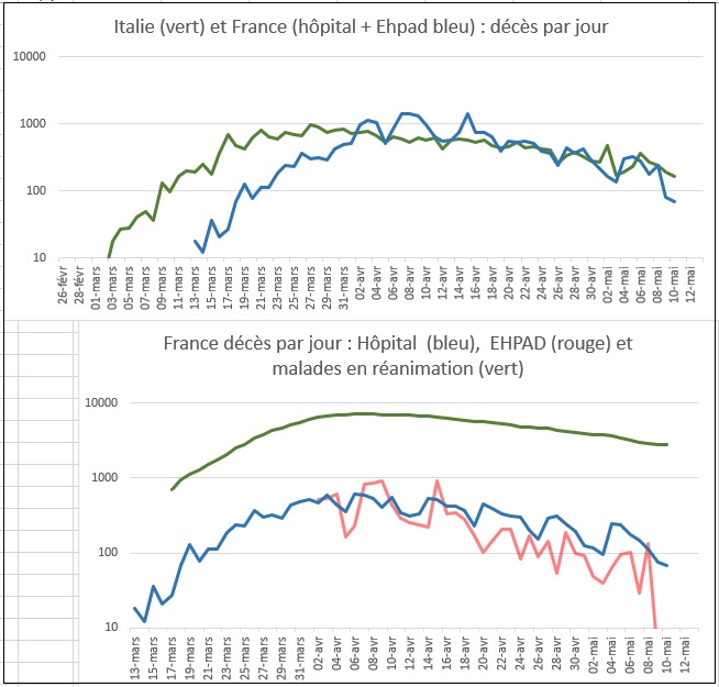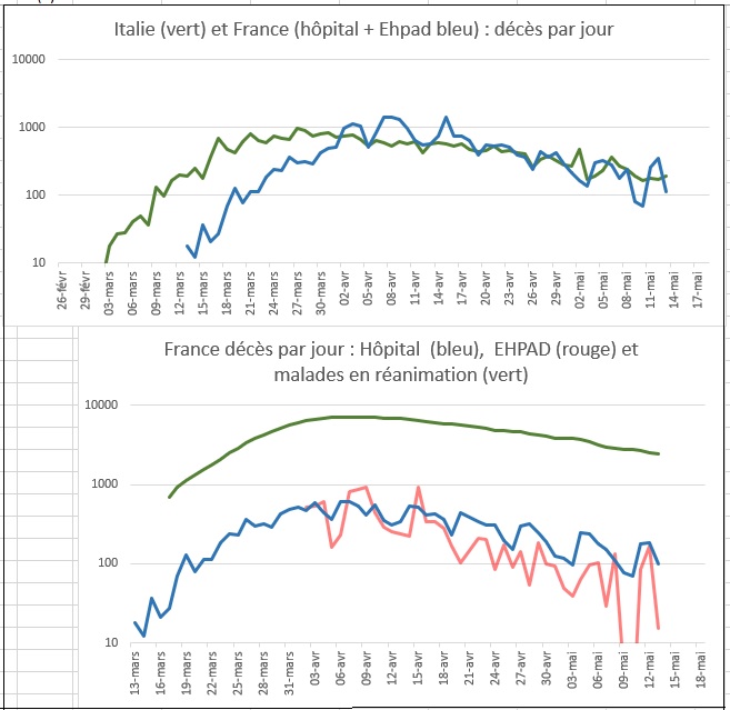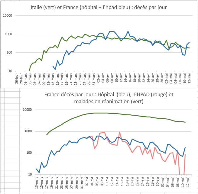 Mardi 12 mai : comme prévu la remontée des décès hospitaliers et d'Ehpad a été importante. Les courbes de la France et de l'Italie restent mêlées.