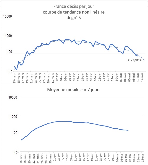 En figure 2, j'ai ajouté l'évolution des décès hospitaliers en France sous la forme d'une moyenne mobile sur 7 jours (chaque jour on ajoute au nombre du jour le nombre des deux jours précédents et des deux jours suivants et on divise le total par 7). Le résultat est très proche de la courbe de tendance de degré 5 du graphique supérieur avec l'avantage de gommer les problèmes de sous-enregistrement et l'inconvénient de retirer deux jours d'affichage à droite et à gauche.