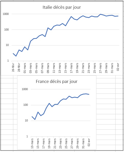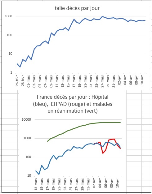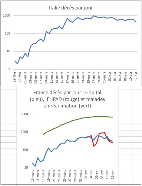 Lundi 13 avril : le pic des décès a été atteint en Italie le 27 mars avec 969/j ; le nombre est aujourd'hui de 431 soit une baisse de 45% en 17 jours. Cela semble graphiquement un palier mais la baisse est bien réelle puisque les décès ont presque été divisés par deux.