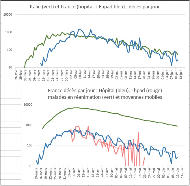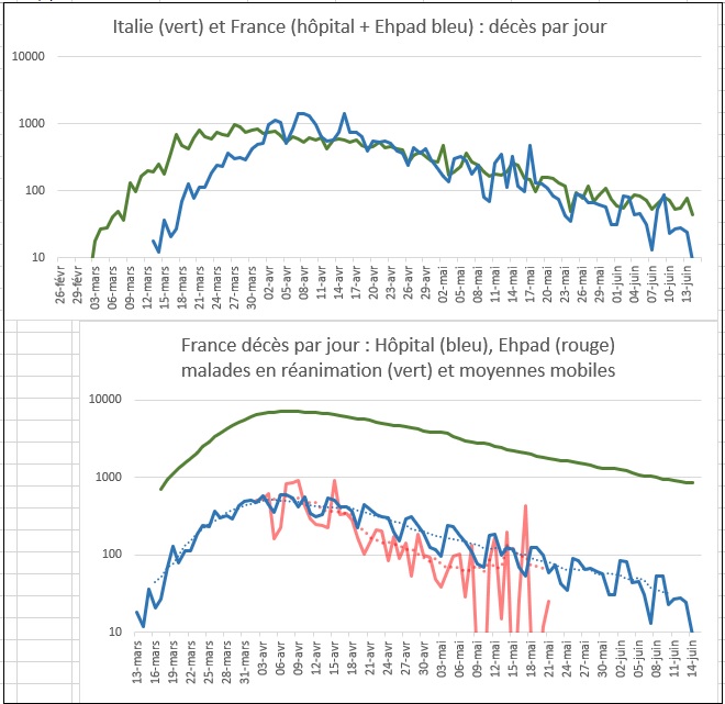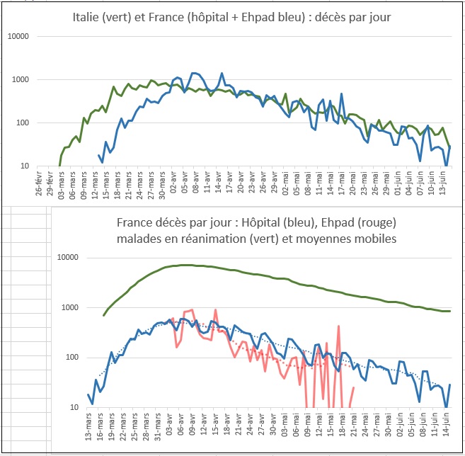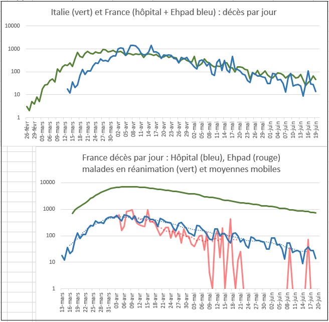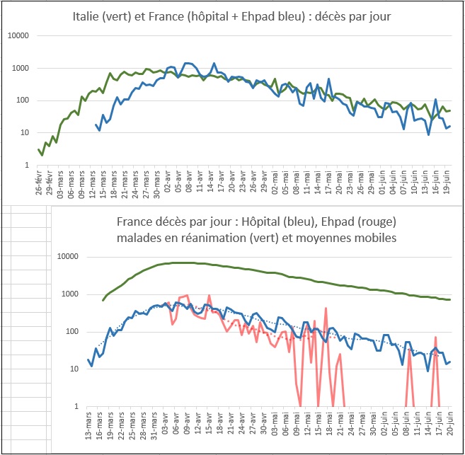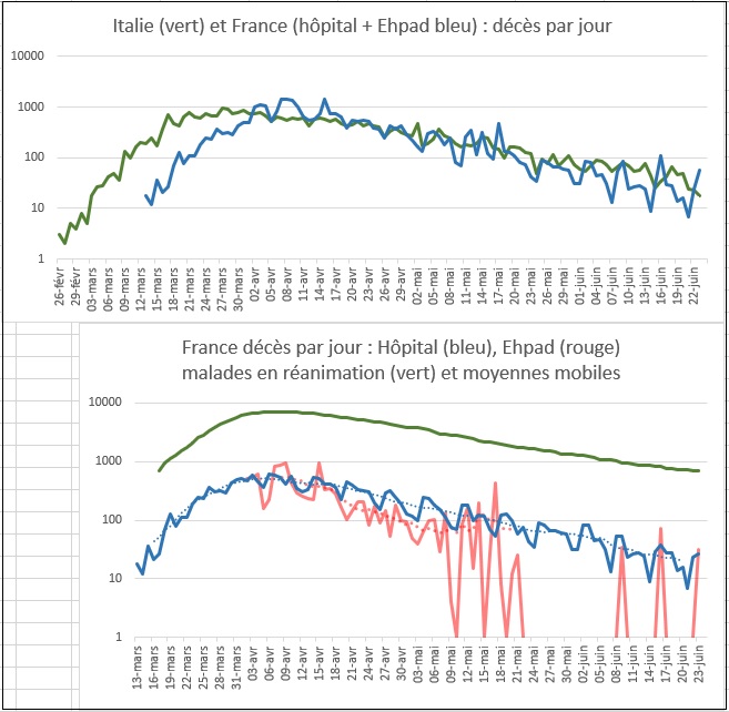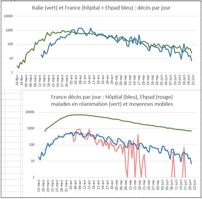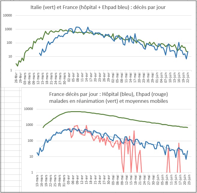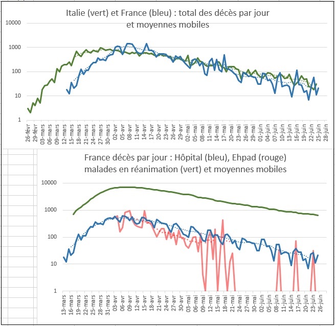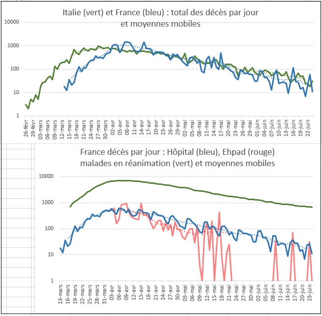 Jeudi 25 juin : comme les totaux de France et d'Italie semblent évoluer différemment en fin de parcours, j'ai ajouté au graphique du haut les moyennes mobiles pour mieux voir les variations.
