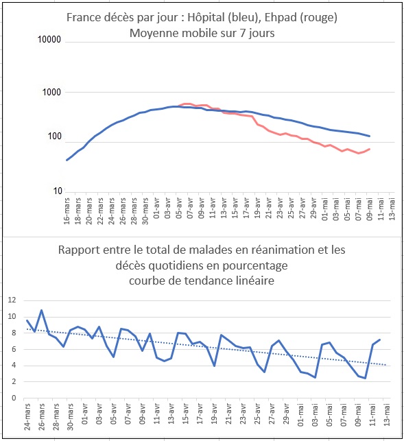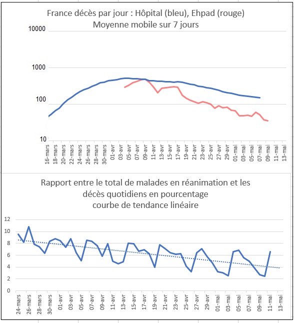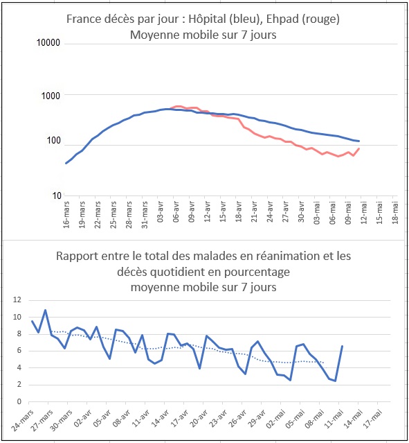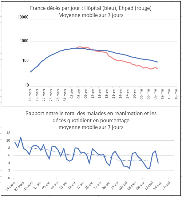 Jeudi 14 mai : sur un fond de décroisance lente, bien marquée par la baisse régulière de la réanimation, les courbes scandées par la semaine pour l'hôpital et de plus erratiques pour les Ehpad sont régularisées par leur moyenne mobile en figure 2.