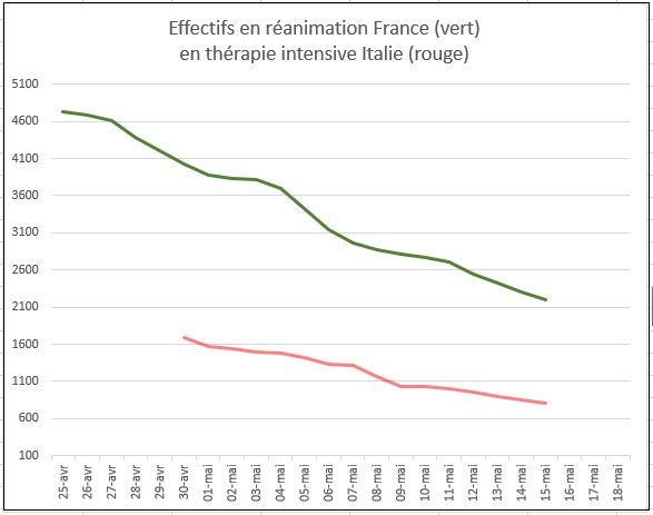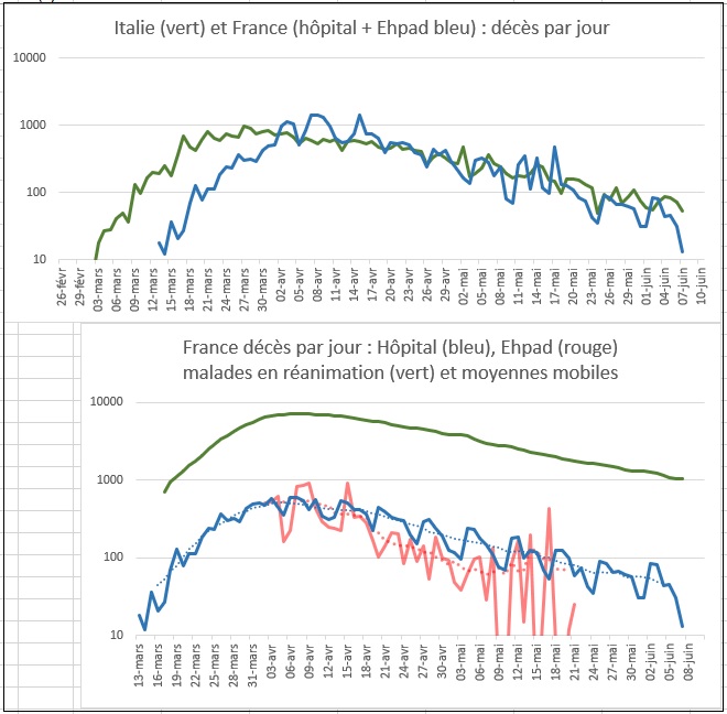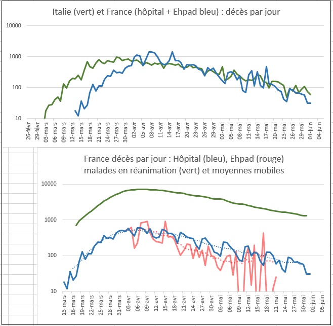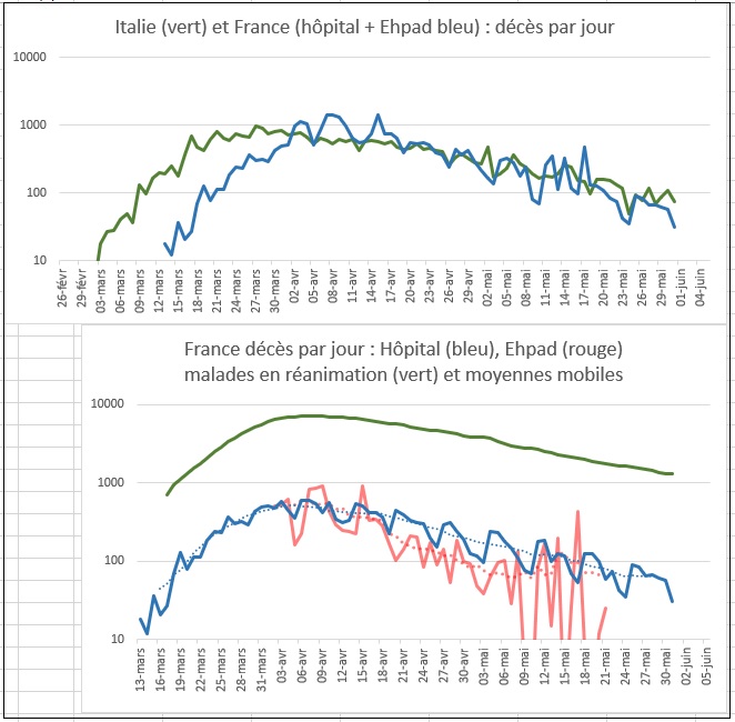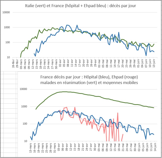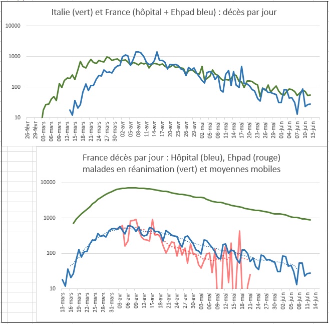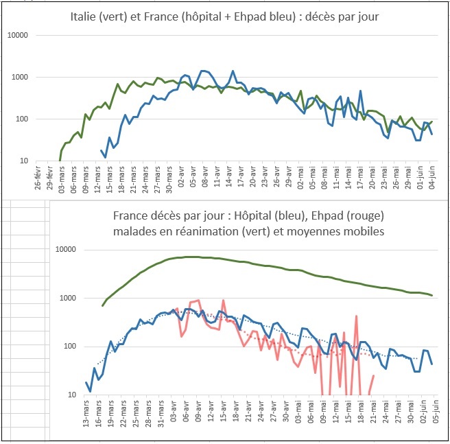 mercredi 31 juin : les sources devenant irrégulières et la tendance à la baisse se présentant elle comme régulière, tant en France qu'en Italie, la présentation quotidienne devient inutile et je n'irai pas plus loin.