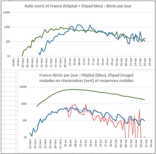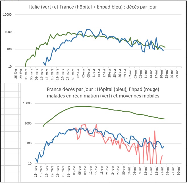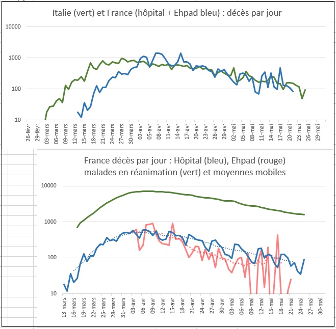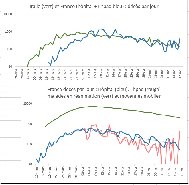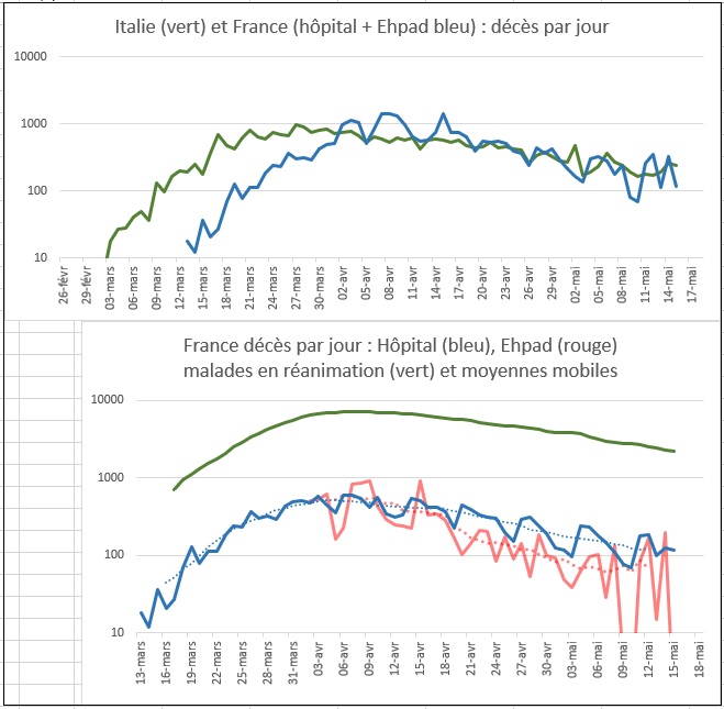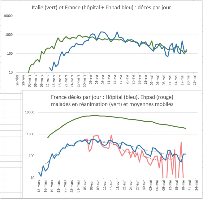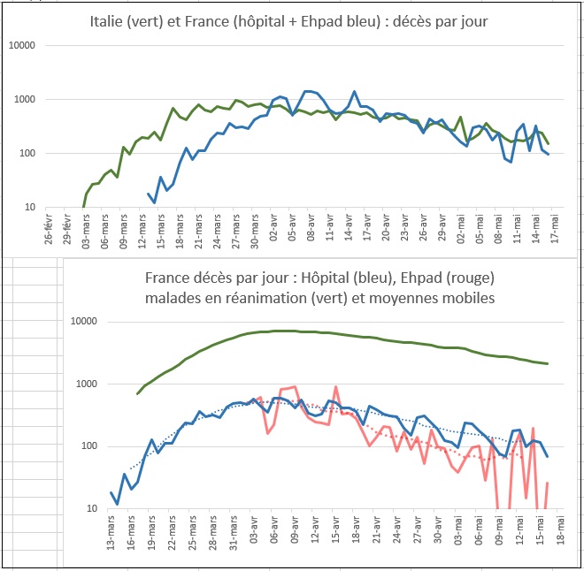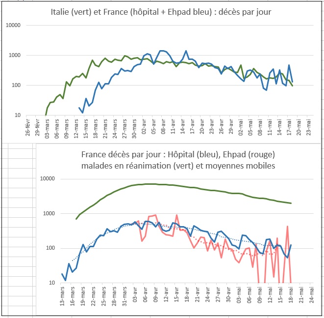 Samedi 16 mai : j'ai intégré les moyennes mobiles sur 7 jours en pointillés sur les courbes des décès hospitaliers, en baisse régulière, et en Ehpad en remontée. En Italie l'évolution reste imprécise.