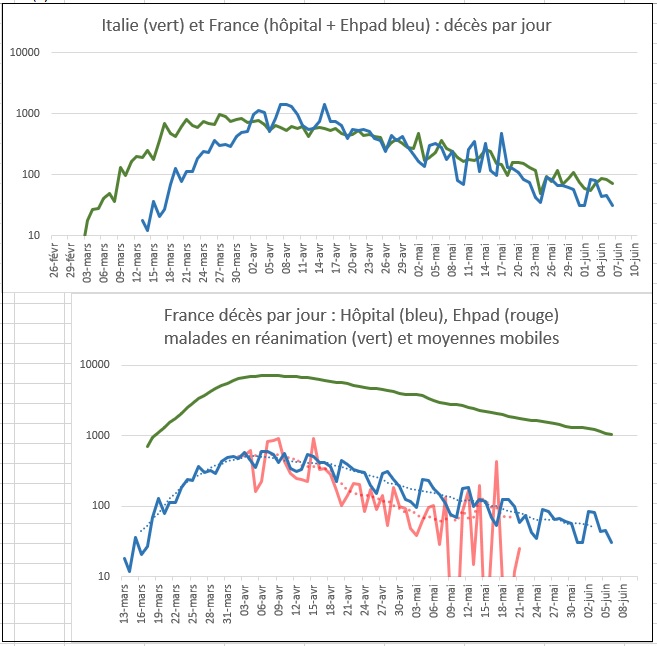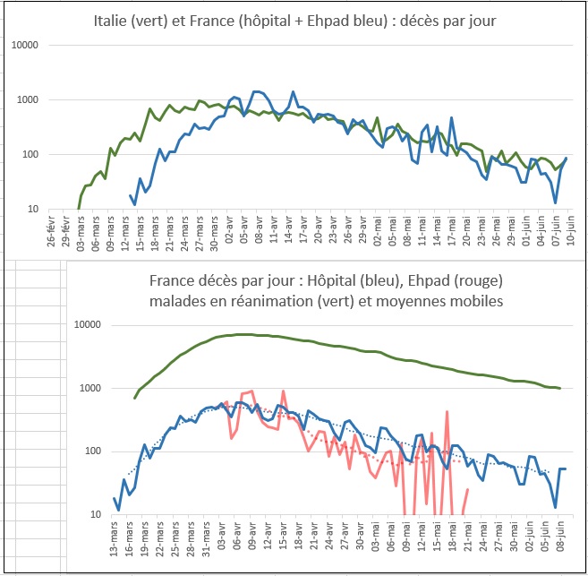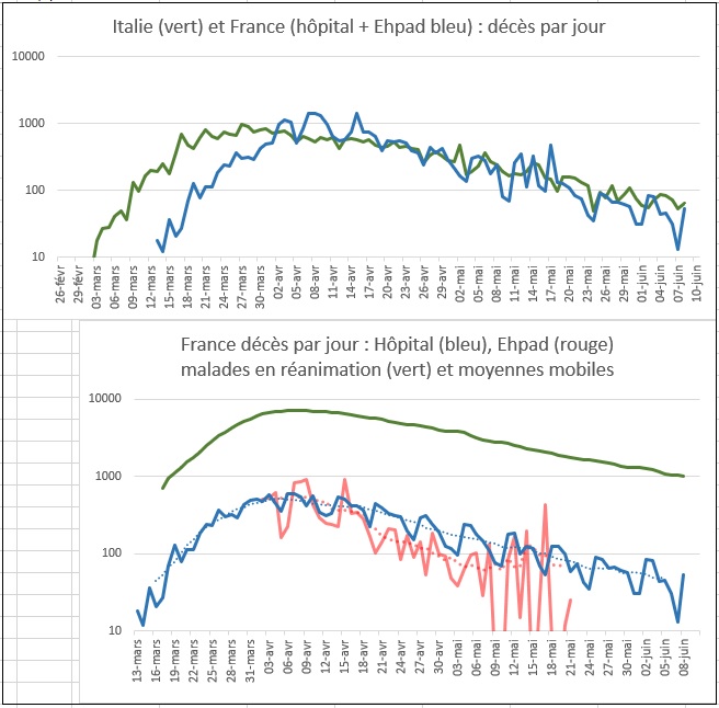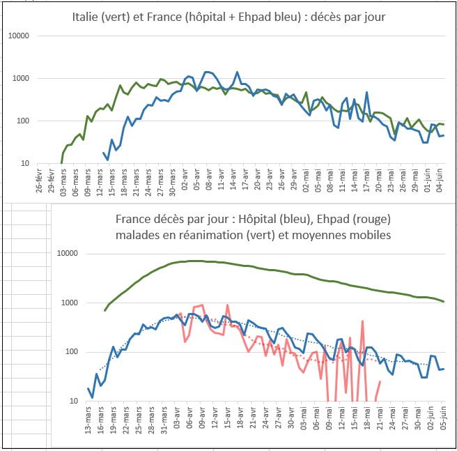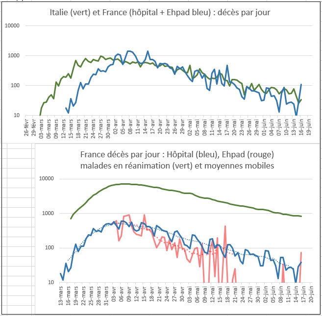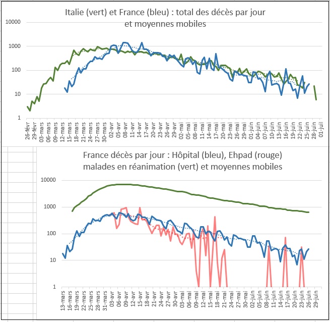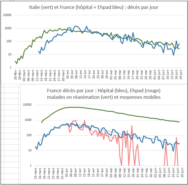 lundi 29 juin : le système d'information italien sur le virus est modifié et des données manquent pour plusieurs jours. Ce WE, les données françaises ne sont pas indiquées. Donc pas de nouveau graphique ni hier ni aujourd'hui.