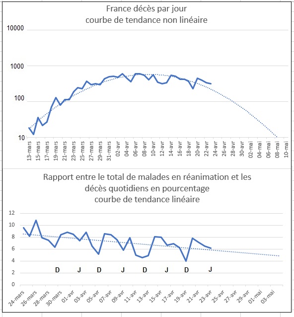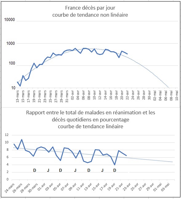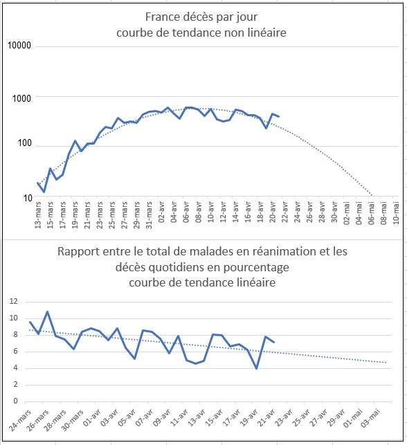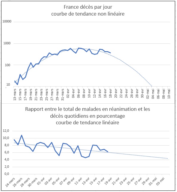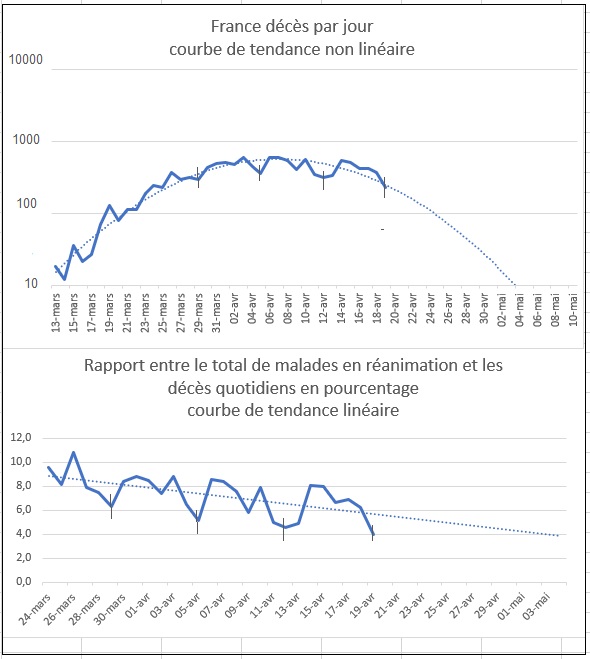 Dimanche 19 avril : le plateau continue en Italie. Pour voir la tendance en France j'ai ajouté dans le graphique 2 deux courbes de tendance. Commençons par celle du bas, déjà vue : il s'agit de l'évolution régulière d'un pourcentage. Si on veut l'extrapoler dans le temps, on voit bien qu'une droite de type y=ax+b calculée pour minimiser les écarts aux différents points observés suffit pour s'affranchir du rythme de la semaine.
