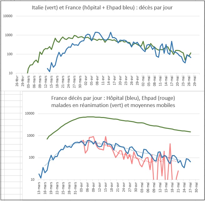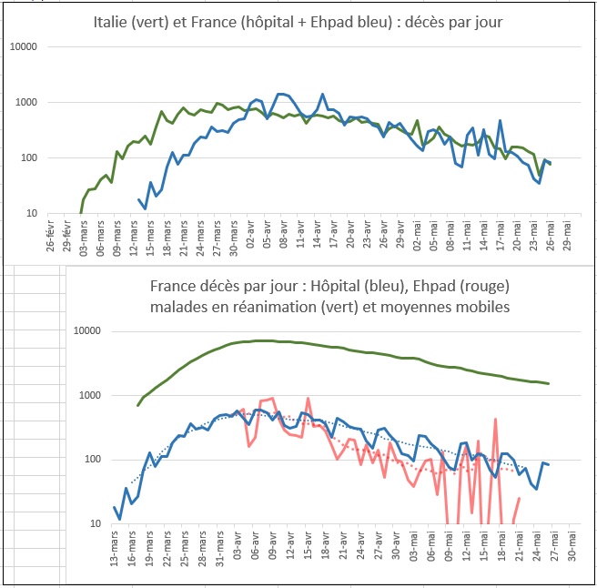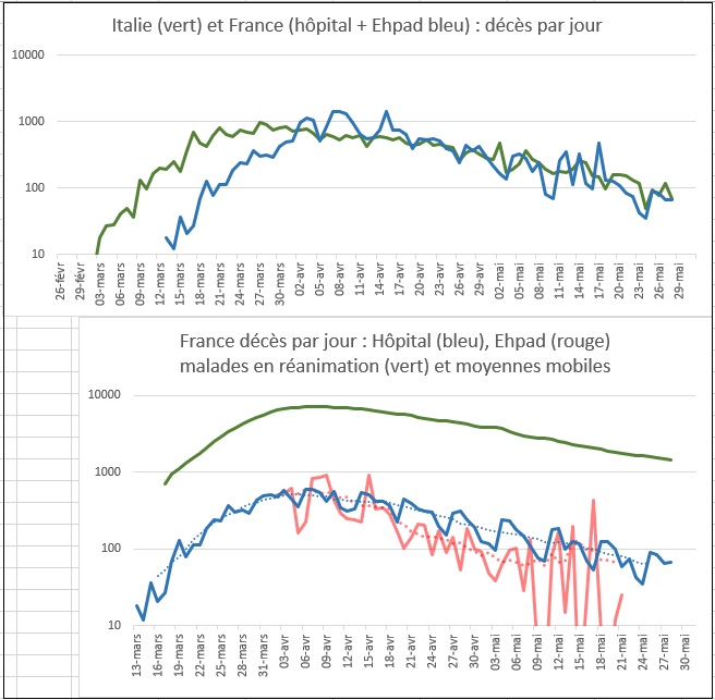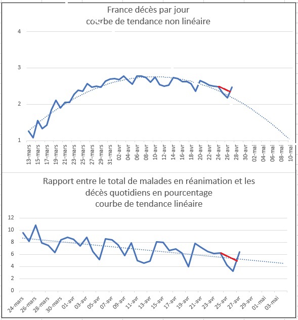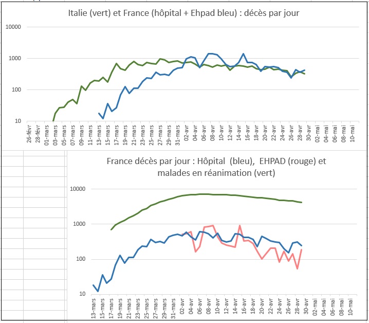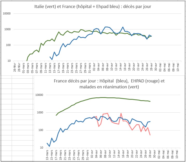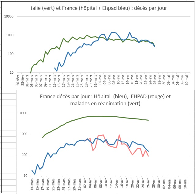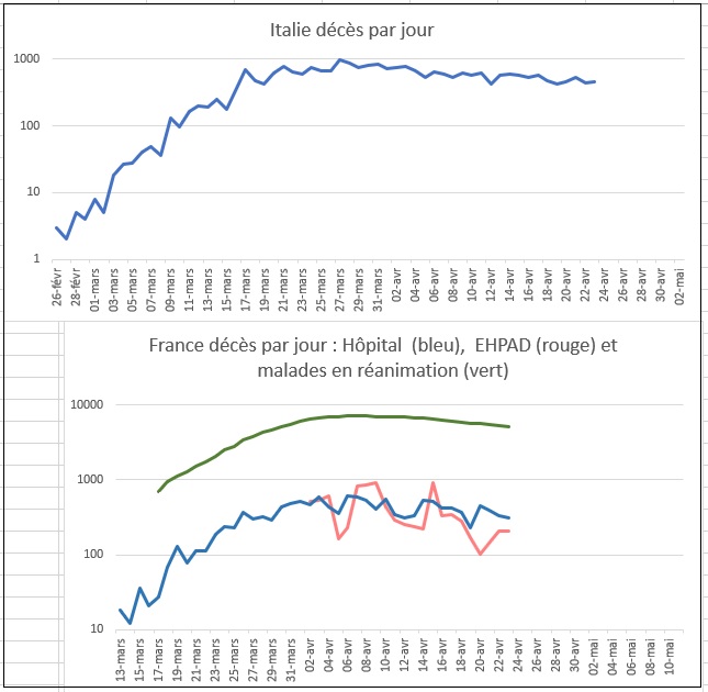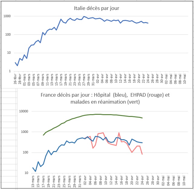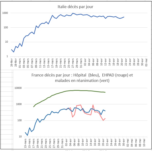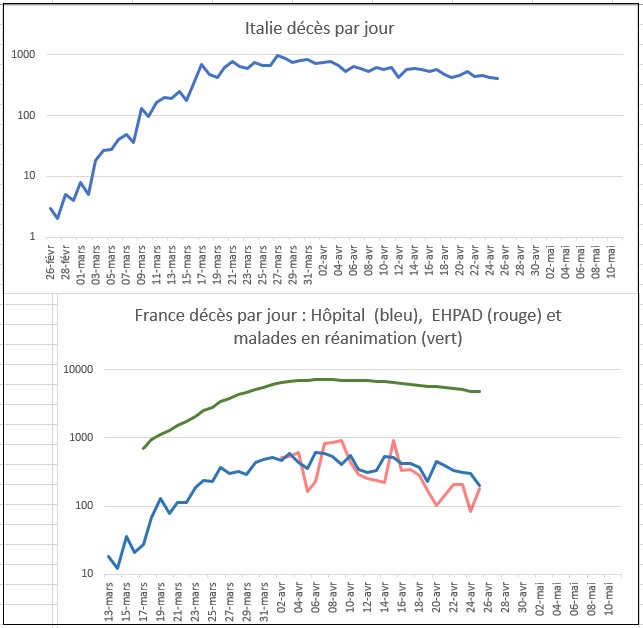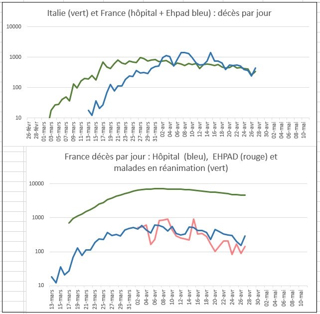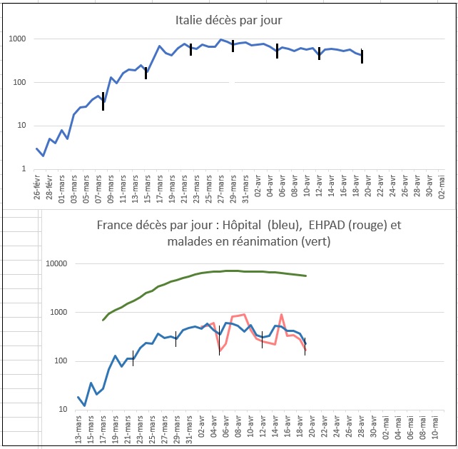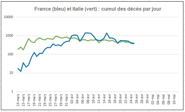 Mardi 28 avril : comme prévu, le sursaut du lundi est sur toutes les courbes, tant en France qu'en Italie. Pour éviter ce genre de problème, il faudrait calculer une moyenne mobile sur une semaine mais son mode d'élaboration fait que l'on a toujours plusieurs jours de retard dans l'affichage. On pourrait prendre également la moyenne du dimanche et du lundi, ce qui est fait en rouge sur la figure 2, mais ce lissage n'apporte pas grand chose.