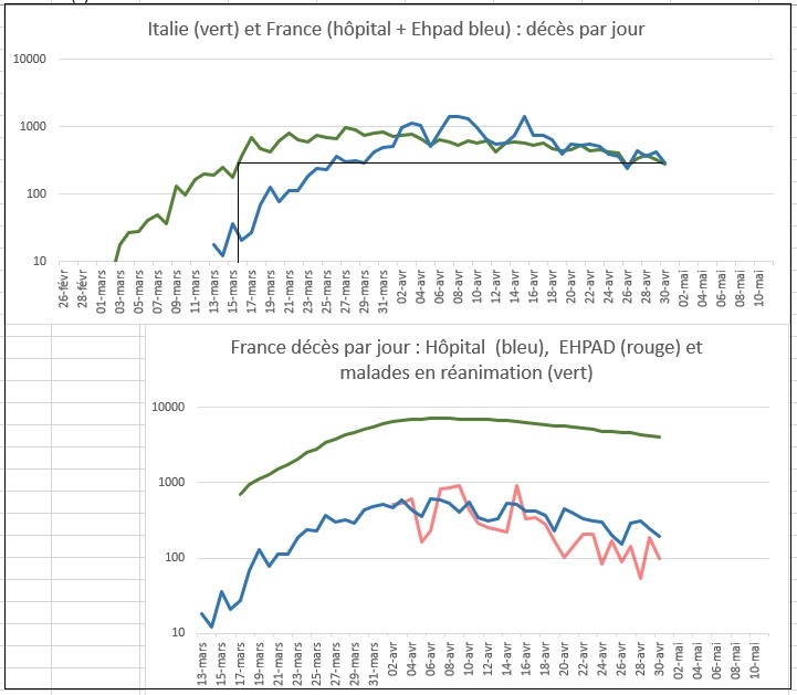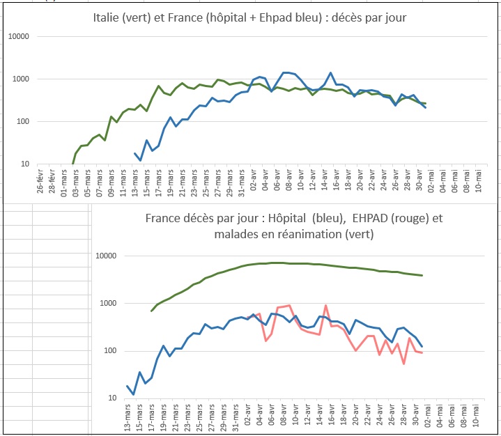 Jeudi 30 avril : le total des décès en France et en Italie continue à suivre la même tendance décroissante de -22% en une semaine. La courbe des Ehpad reste erratique mais suit, à un niveau plus bas, la même tendance que la courbe hospitalière.