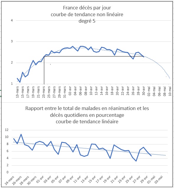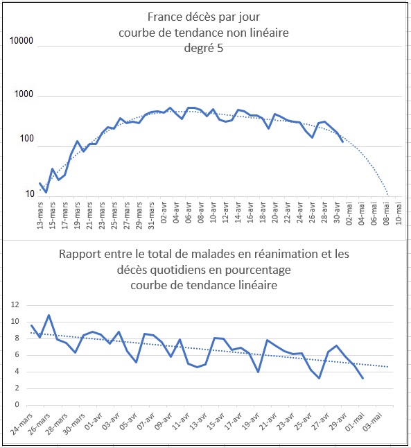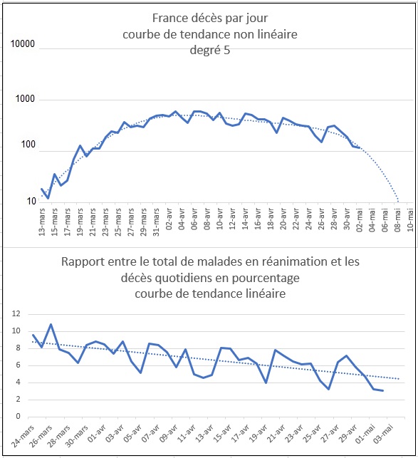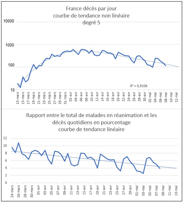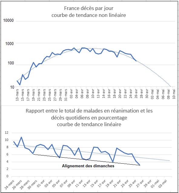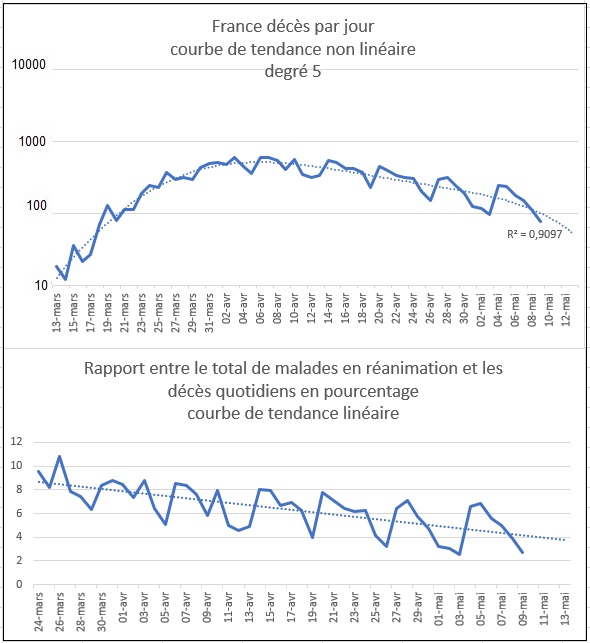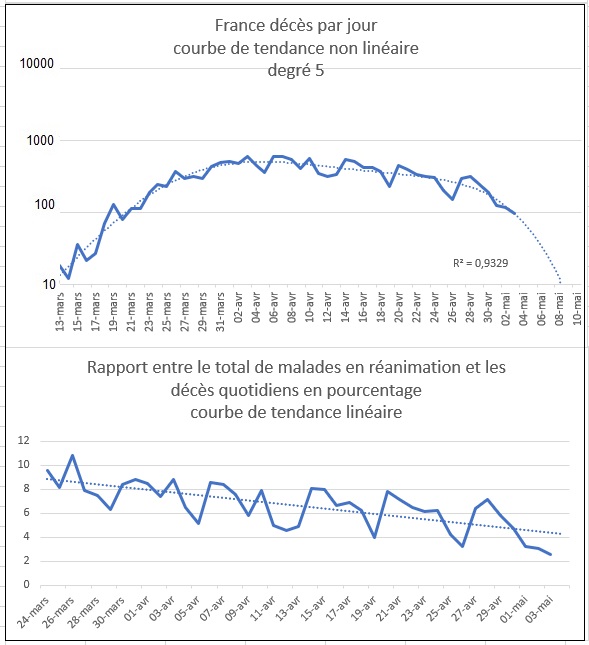 En figure 2 également, graphique du bas, la tendance linéaire devient inadaptée à un tassement de l'efficacité de la réanimation. Il faudra passer là aussi à la moyenne mobile.