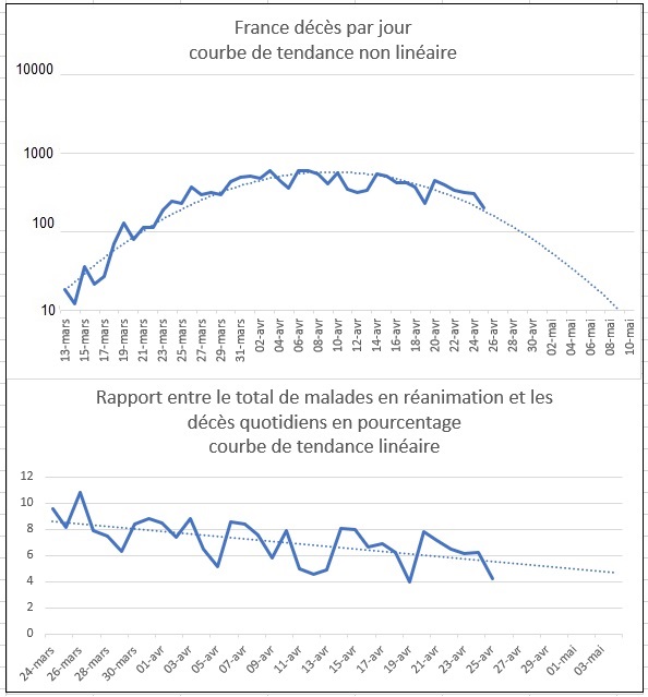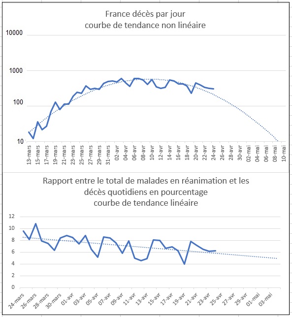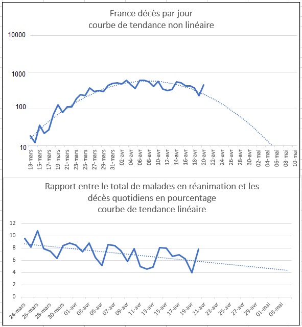 Jeudi 23 avril : l'effet de plateau, déjà visible en Italie, se dessine-t-il en France ? En effet la descente qui se manifeste de jour en jour est plus lente que la montée pour le nombre de personnes en réanimation. Il faut remarquer cependant que la baisse lente de la réanimation est compensée par une amélioration de son efficacité comme le montre toujours la courbe du bas de la figure 2.