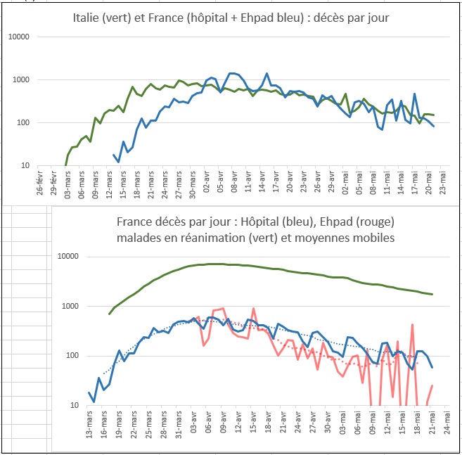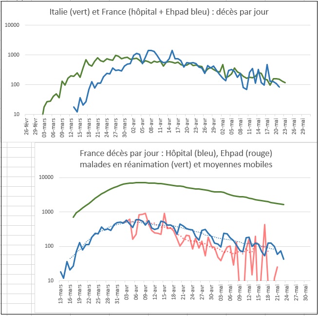 Vendredi 15 mai : le graphique tout en haut est inquiétant car il marque tant pour la France que pour l'Italie une remontée du total des décès. Si la France n'est déconfinée que depuis une semaine, l'Italie a commencé une semaine plus tôt et les effets délètère s'en font peut-être sentir. Cela reste à voir les jours prochains.