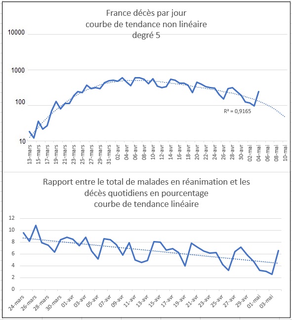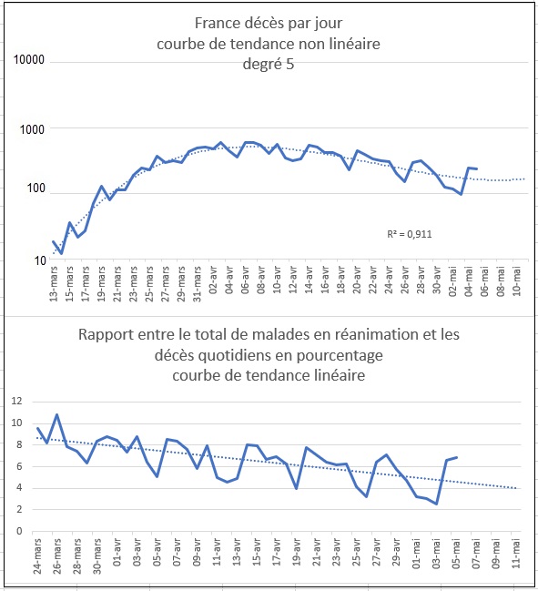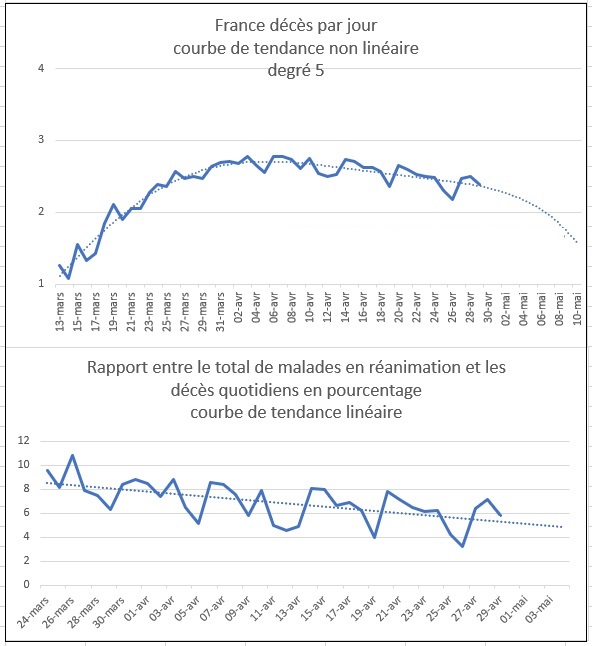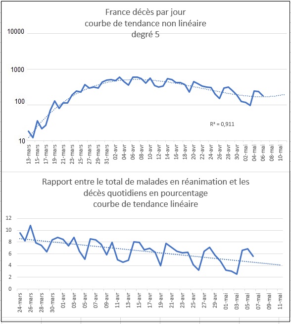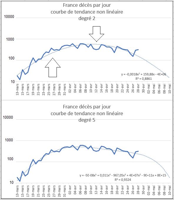 Sur la figure 2 la tendance des décès hospitaliers en France est représentée par (en haut) la représentation des jours précédents qui est dite de degré 2 parce que la formule correspondante (indiquée sur le graphique) exprime la variable avec le paramètre le plus élevé de puissance 2. Cette courbe devient fautive car comme le montre les deux flèches, des secteurs longs d'observations s'écartent de la tendance. C'est pourquoi une courbe de degré 5 (voir formule) est proposée (en bas) qui est beaucoup plus proche de l'observation. C'est ce que manifestent les deux indicateurs de qualité R2, rapport qui varie entre 0 et 1 et qui sert à comptabiliser les écarts entre tendance et observation : le R2 de la courbe du bas est meilleur que celui de la courbe du haut.