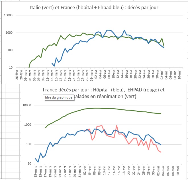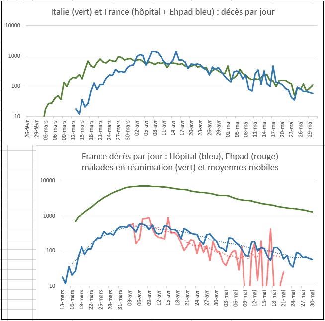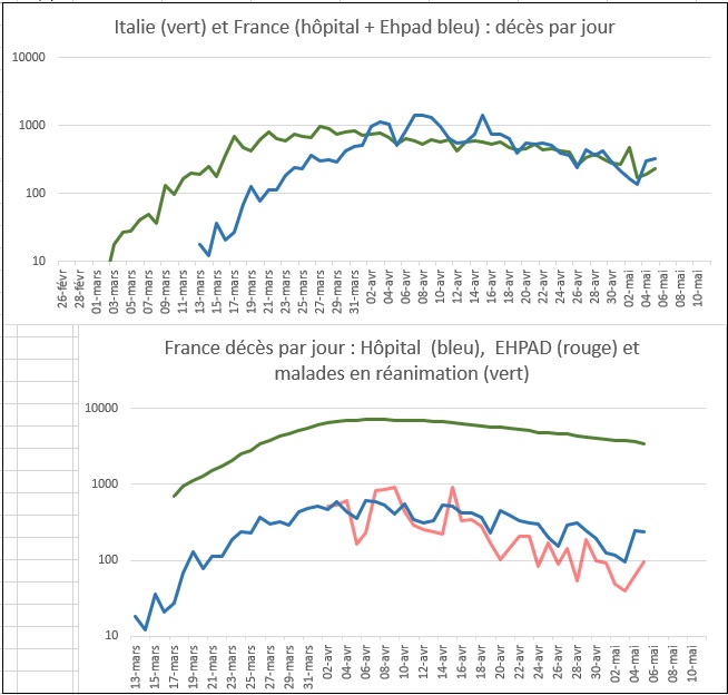 Sur la figure 1 on voit que la décroissance en France est analogue pour les décès hospitaliers et ceux des Ehpad, avec moins de régularité (statistique) pour les Ehpad.