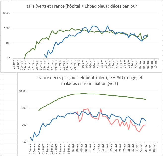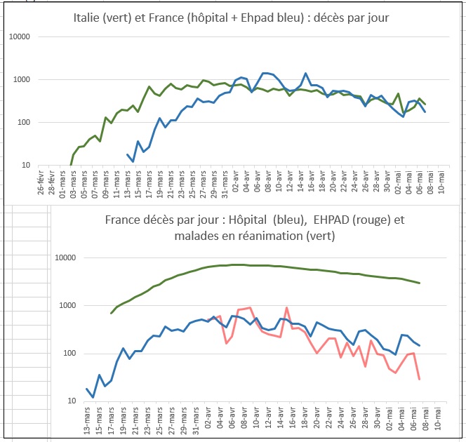 Jeudi 7 mai : déconfinement en Italie à J+4, en France à J-4 ; il ne semble pas y avoir de différence entre des courbes erratiques mais qui se rassemblent aujourd'hui.