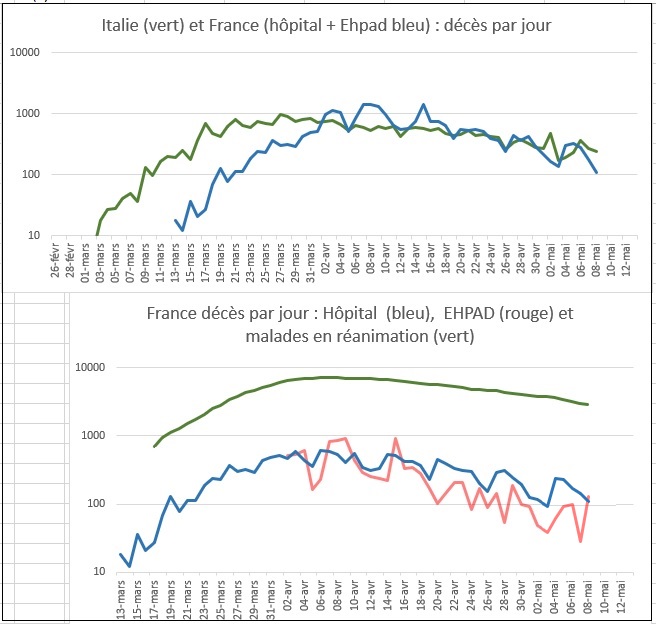 Samedi 9 mai : tant en France qu'en Italie (où la fête du 8 mai est également célébrée), le sous-enregistrement est à l'oeuvre. En France, pour la première fois depuis le 15 avril, la courbe en Ehpad dépasse celle de l'hôpital. L'interprétation en semble prématurée.