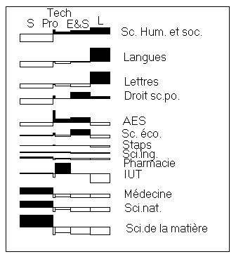 Lettres et langues recrutent spécifiquement en L ; quant à Droit, AES et sciences éco, ils sont intermédiaires, avec un recrutement central en Economique et Social.