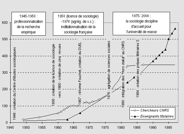 La sociologie va pourtant progressivement s'imposer, tant à l'Université qu'au CNRS. Son institutionnalisation se réalisera d'autant plus sûrement qu'elle fera la preuve de sa scientificité (contenue en grande partie dans le recours à l'instrument statistique). Mais ceci passera par un double abandon : celui de sa vocation sociale, et celui de sa dimension purement spéculative, héritée de la philosophie.