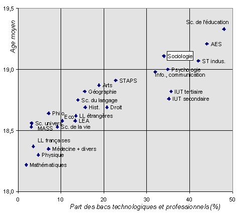 La venue en sociologie (ou en psychologie) est possible pour tout bachelier qui n'a pas pris de filière sélective. On ne peut évidemment en dire plus à partir de ces données sur les motivations d'entrée en sociologie dont on sait par ailleurs qu'elles correspondent à un intérêt possible pour le social (en particulier pour ceux qui ont fait la série ES) mais à partir de l'indicateur de la série du bac on peut faire les commentaires suivants :
